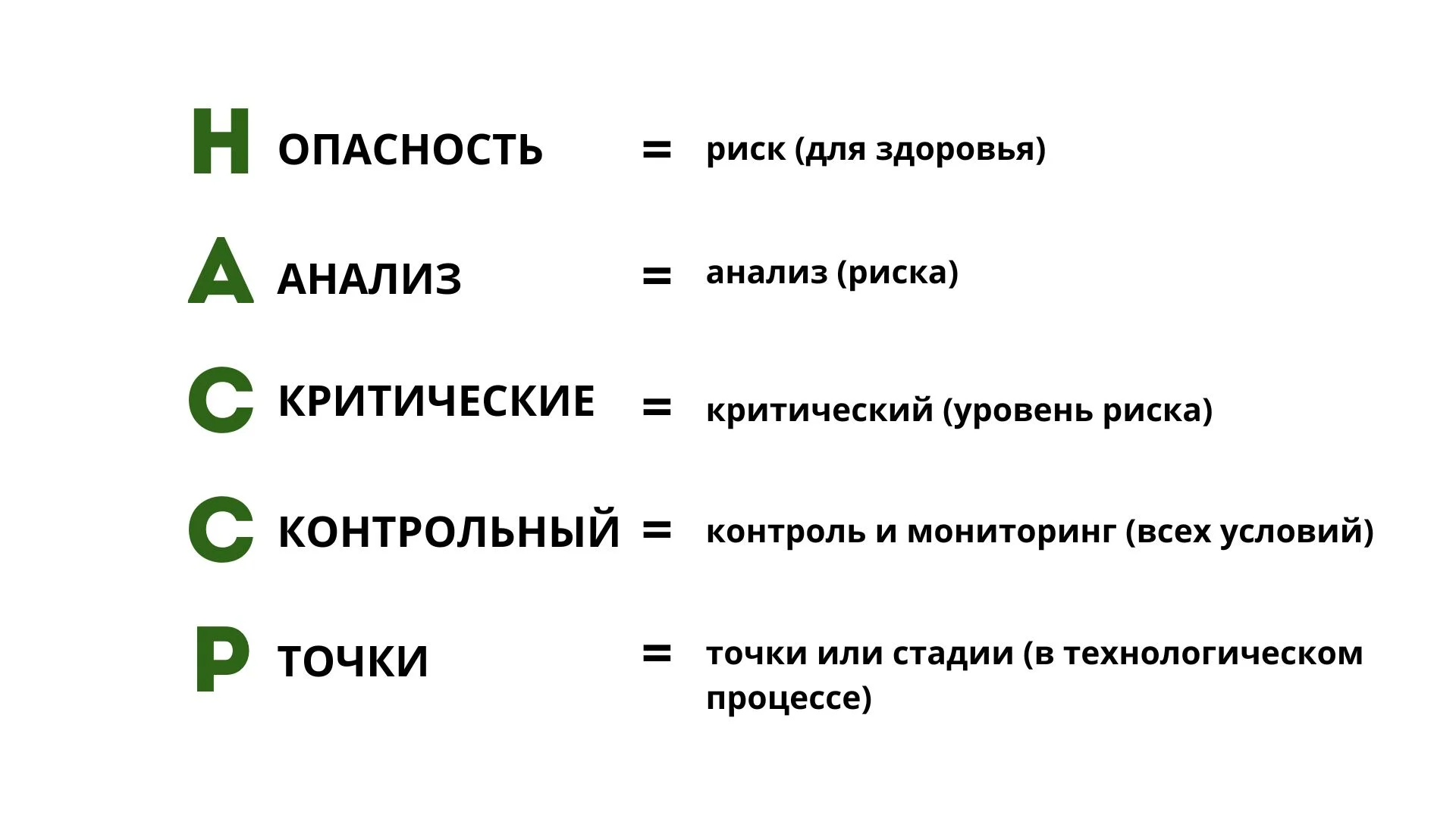 ХАССП — это расшифровка английской аббревиатуры HACCP, в которой каждое слово дословно переводится следующим образом: